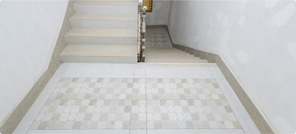 Special attention was given to the staircases, where durable, slip-resistant tiles were installed, ensuring safety while maintaining the architectural design of the building.